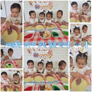 오늘은 고구마 스페셜데이의 마지막 날이었습니다.영아반 모든 친구들이 함께 고구마를 주제로 즐거운미술놀이를 했답니다.먼저 나뭇잎이 새겨진 고구마 도장을 스탬프에 콩콩찍어보며 고구마 단면의 모양과 질감을 느껴보았답니다.도작을 찍을 때마다 예쁜 나뭇잎 무늬가 종이에나타나자 아이들이 "와~!"하며 신기해했답니다.또한 만 1세 친구들은 플레이콘을 활용해 고구마꾸며보기 활동을 했습니다.말랑말랑한 플레이콘을 손가락으로 꾹꾹 눌러 붙이며자신만의 고구마를 완성하는 모습이 참 귀여웠답니다.이번 고구마 스페셜데이를 통해 아이들은 고구마의색과 모양, 질감을 오감으로 경험하며 자연에대한 호기심과 표현력을 풍부하게 키워볼 수있었습니다.집에서도 고구마를 함께 살펴보며"이건 어떤 냄새일까?", "껍질은 어떤 색일까?"질문을 나누어 보시면 아이의 탐색이 더욱 확장될 것같습니다.부모님들의 많은 관심과 협조에 감사드립니다~^^