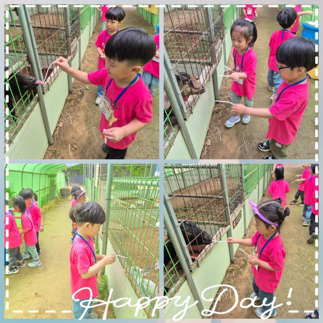 나무들과 꽃 구경을 하고 동물친구들에게 먹이주기 활동 염소,토끼, 돼지 등 먹이 들고