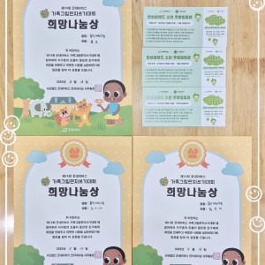 지난번 참여 안내드렸던*[제14회 굿네이버스 가족 그림편지 쓰기대회]*에작품을 제출한 원아들이 희망 나눔상을수상하였습니다.제출한 친구들 모두 상자잉 수여되었으며, 함께 받은안성팜랜드 소인 무료입장권도 아이드로가 나누어 주었습니다.아이들이 가족과 함께 의미 있는 시간을 보낼 수 있는소중한 기회가 되기를 바랍니다.참여해 주신 가정에 다시 한 번 감사드립니다!
