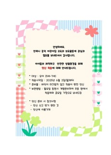 홍익가족 학부모님 안녕하세요푸르름이 가득한 오월만개한 꽃들 사이로 향긋한 바람이 불어노는사랑 가득한 날들 입니다.계절의 변화 속에서 자연은어느새 짙어지는 초록빛으로 우리 아이들을반기고, 마음까지 따스하게 감싸주는 햇살이하루하루를 특별하게 만들어줍니다.사랑스런 자녀들과 더욱 특별한 날들이 되기 위해부모님들께서 최선을 다하시고 계신 마음늘 응원합니다.가정의 달인 오월아동학대예방 교육이 있어 알려드립니다.줌으로 교육이 이루어 집니다.교육을 들으시고 수료증을 제출 하시는 학부모님께소정의 선물을 드립니다.꼭 들으시고 선물도 받아가세요.홍익 학부모님들의 적극적인 참여기대해봅니다.*신청방법*용인시 육아종합지원센터 홈페이지(https://www.yicare.co.kr/)접속 후 로그인 >> 가정양육지원>>교육 및 행사>>달력 6월로 변경>> 부모교육신처(부모님이 개별적으로 신청)자세한 사항은 첨부된 안내문을 참고해주시기 바랍니다.문의)0310335-8690(내선3번)