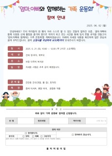 엄마,아빠와 함께하는 가족 운동회참여 안내 및 수요조사서가 나갑니다.6월 5일(목)까지 작성하셔서 보내주세요.참석여부/ 인원을 꼭~! 작성해주세요.바쁘시더라도 우리 홍익친구들의추억을 저장하기 위해이모,삼춘, 할아버지, 할머니, 누나 등누구나 참석할 수 있으니,많은 참여 부탁드립니다.오늘도 행복한 저녁시간 되세요.